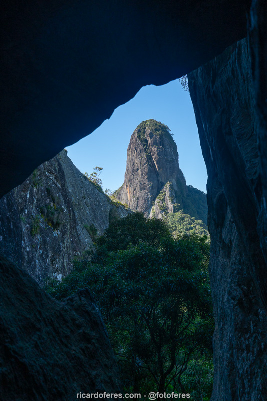 Para chegar na Ana Chata é preciso passar por uma pequena gruta, de onde se tem essa vista para a Pedra do Baú.