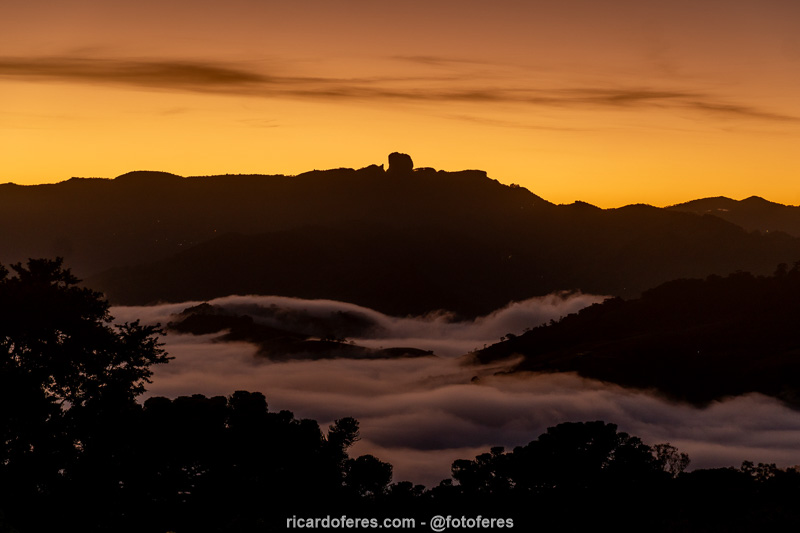Pedra do Baú e São Bento do Sapucaí (abaixo da neblina) vistos no amanhecer.